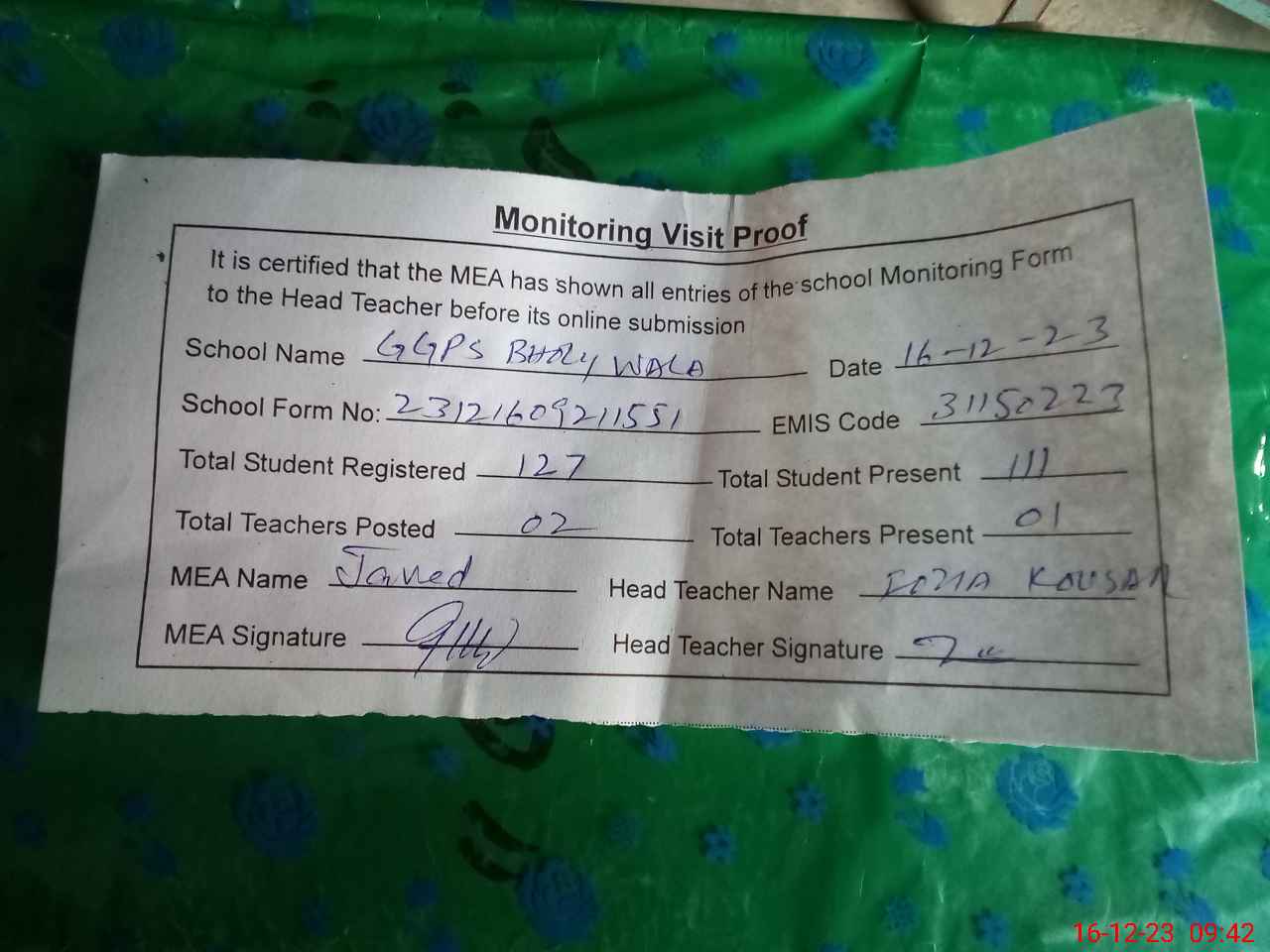 | Attendance Register | Head Teacher | MEA with School | Visit Proof |