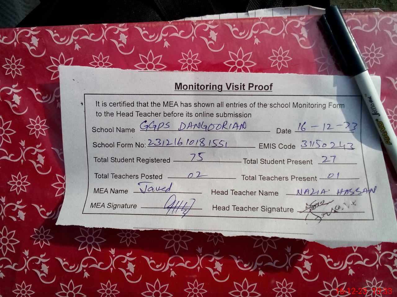 | Attendance Register | Head Teacher | MEA with School | Visit Proof |