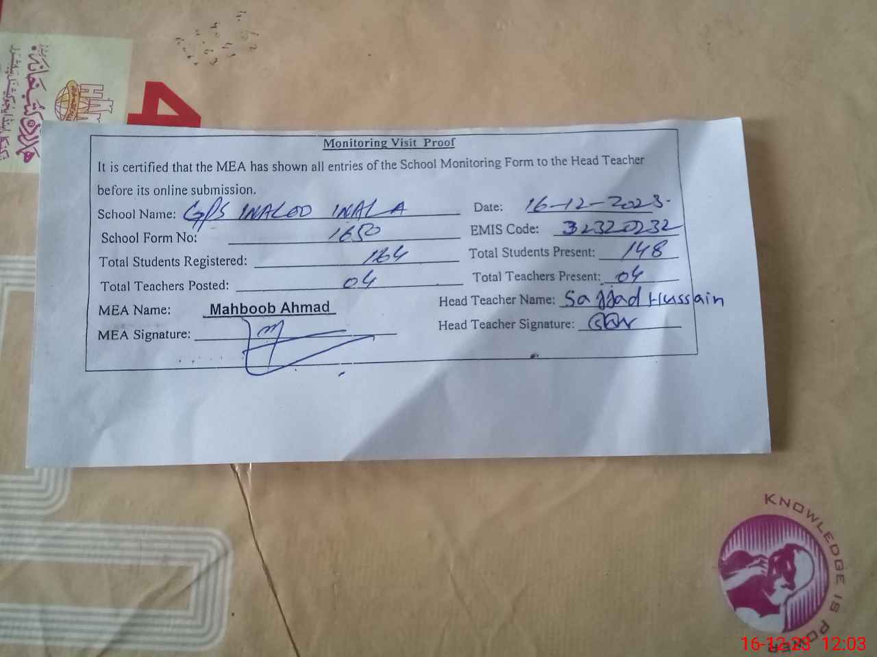 | Certified that this School was Inspected by the Undersigned MEA/DMO Today and the Information Stated Above is as Per Record. | |||||
