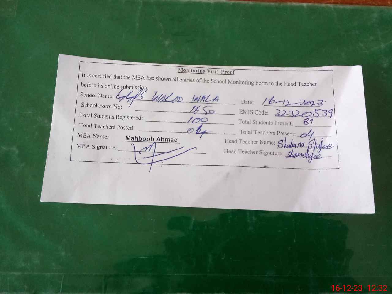 | Attendance Register | Head Teacher | MEA with School | Visit Proof |
