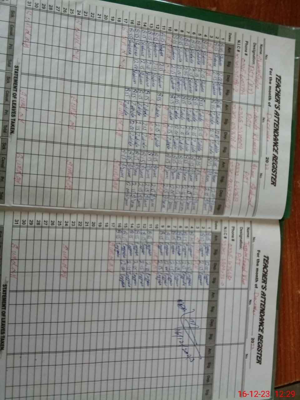 | CNIC | Full Name | Designation | R/C | Absence During Last Calender Month |