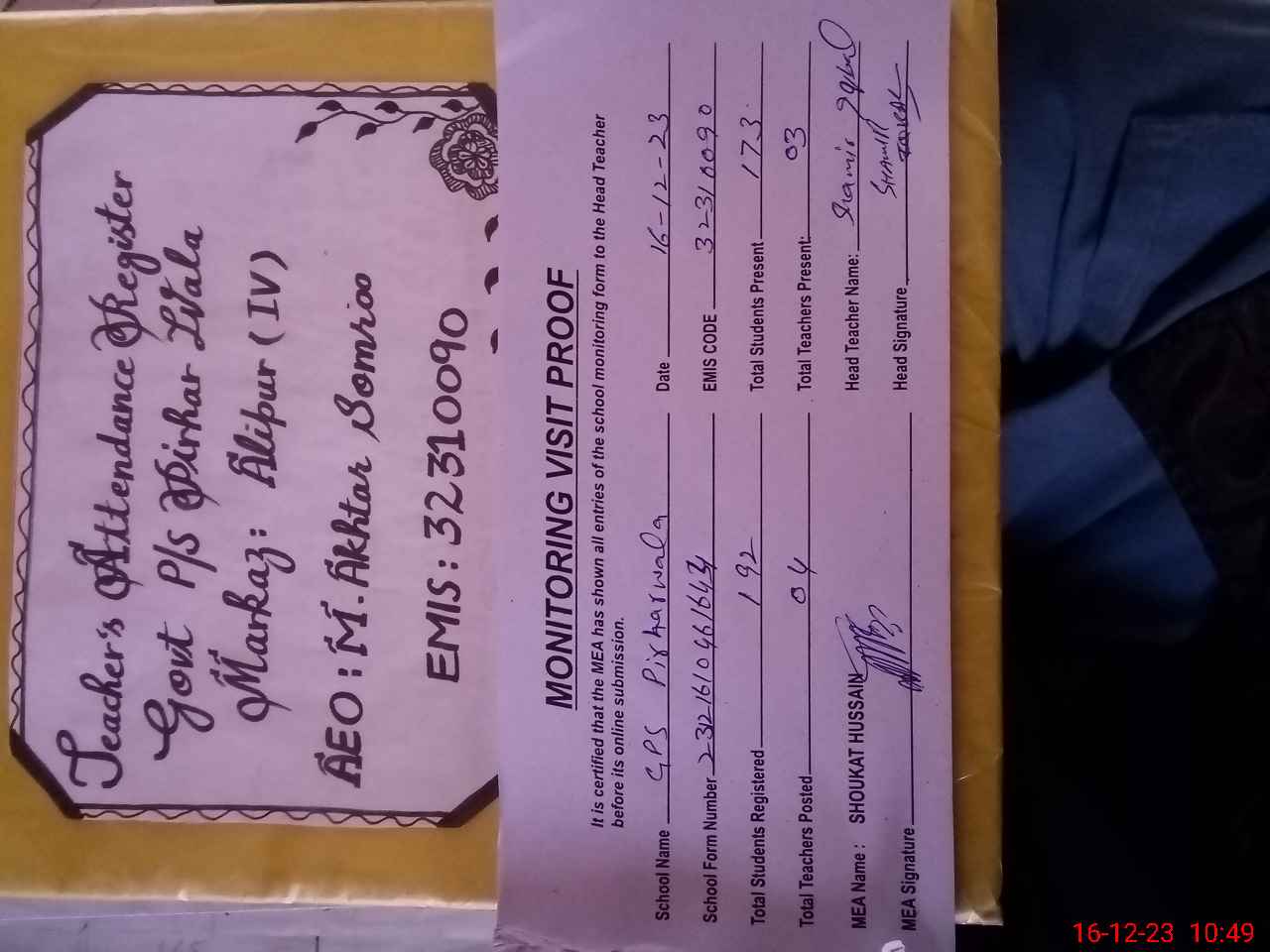 | Attendance Register | Head Teacher | MEA with School | Visit Proof |