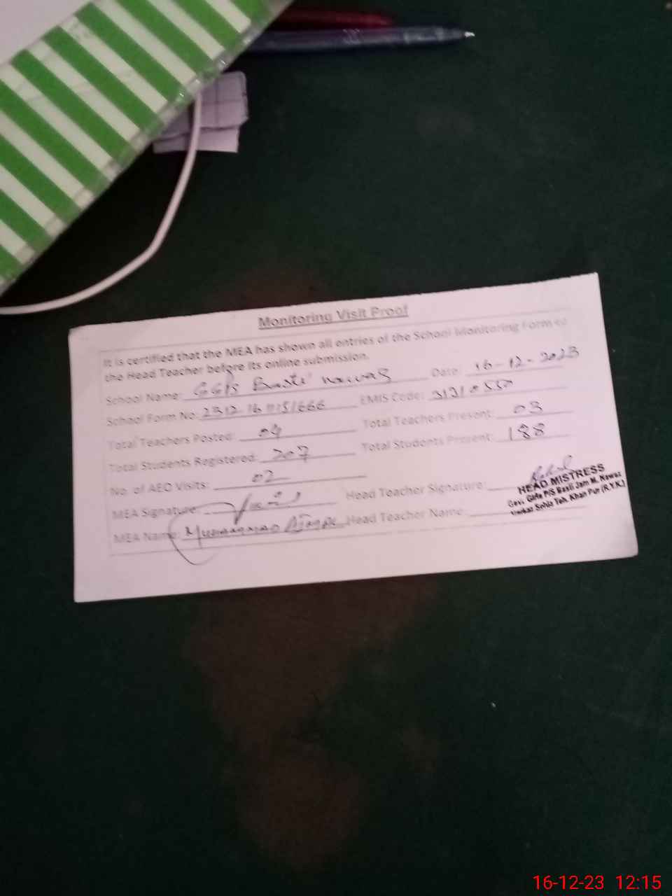 | Attendance Register | Head Teacher | MEA with School | Visit Proof |