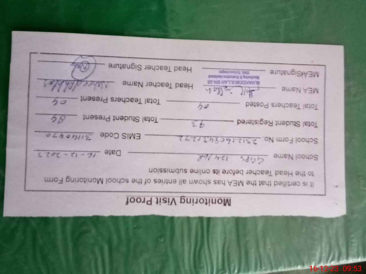 | Attendance Register | Head Teacher | MEA with School | Visit Proof |