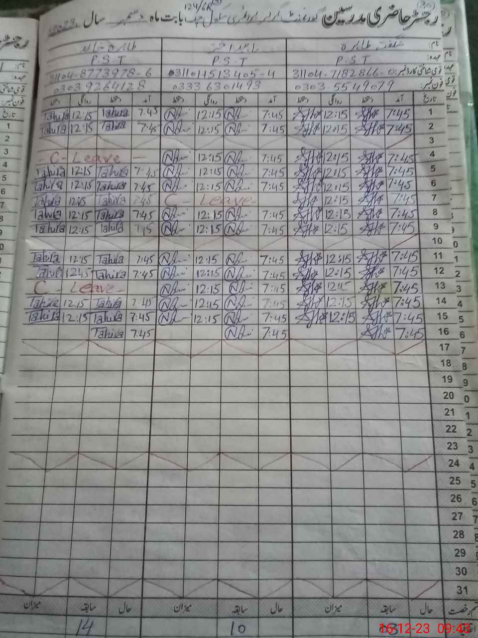 | CNIC | Full Name | Designation | R/C | Absence During Last Calender Month |