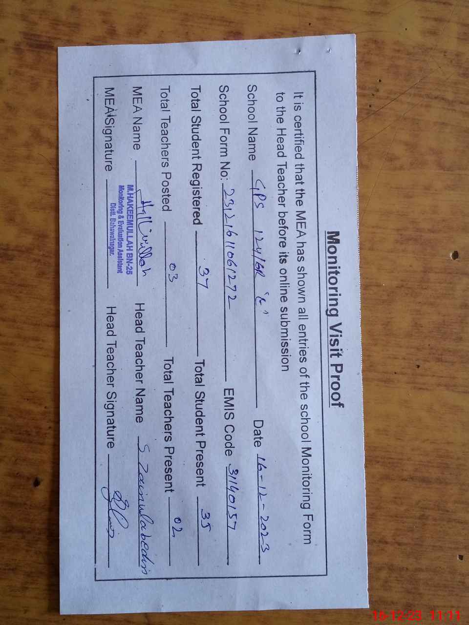 | Attendance Register | Head Teacher | MEA with School | Visit Proof |