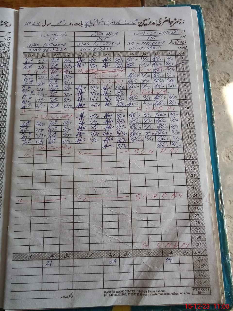 | CNIC | Full Name | Designation | R/C | Absence During Last Calender Month |