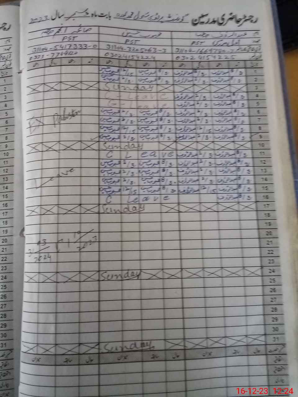 | CNIC | Full Name | Designation | R/C | Absence During Last Calender Month |