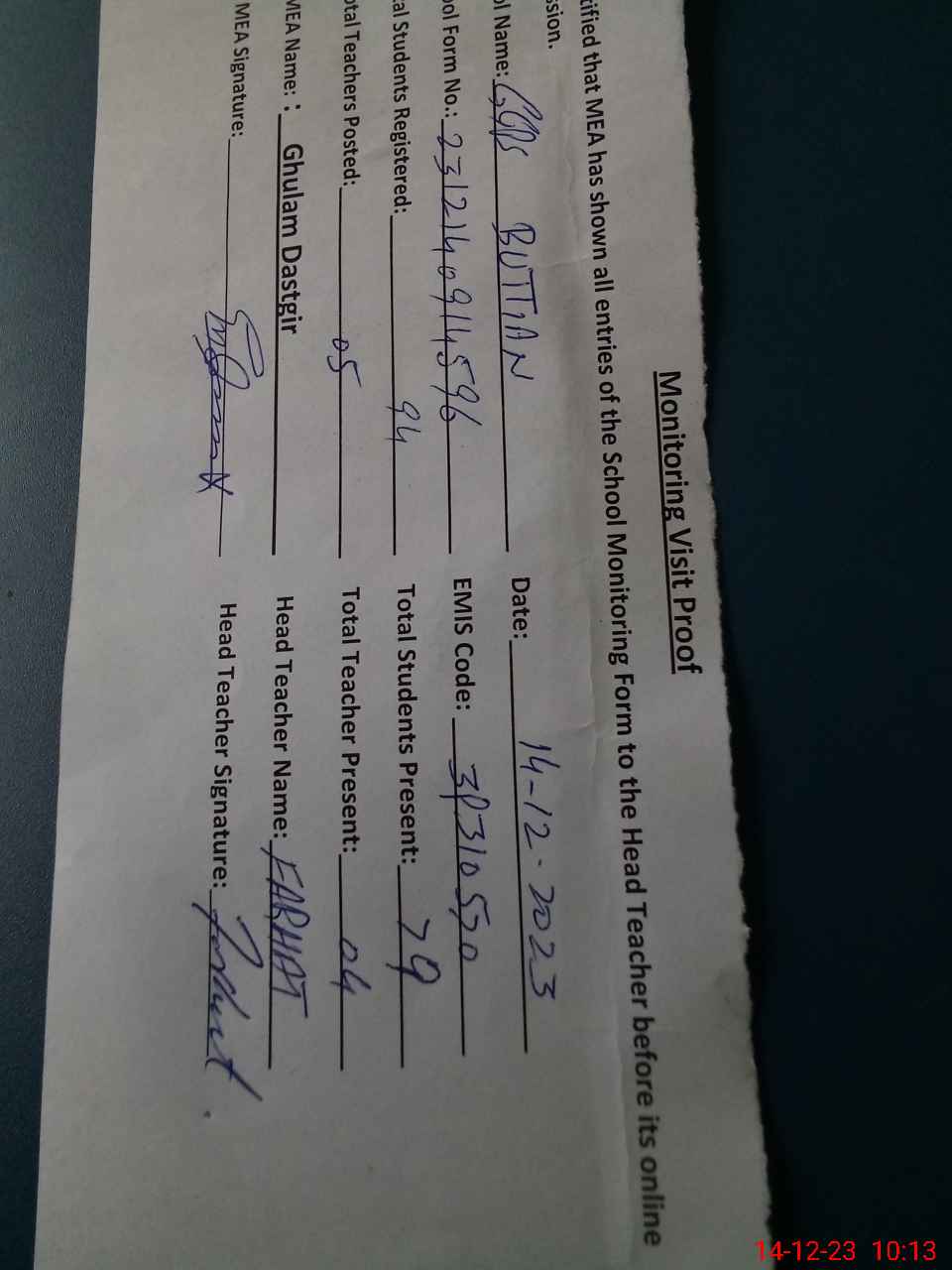 | EMIS Code: 39310570 | Name of School: GGPS BUTTIAN | |||