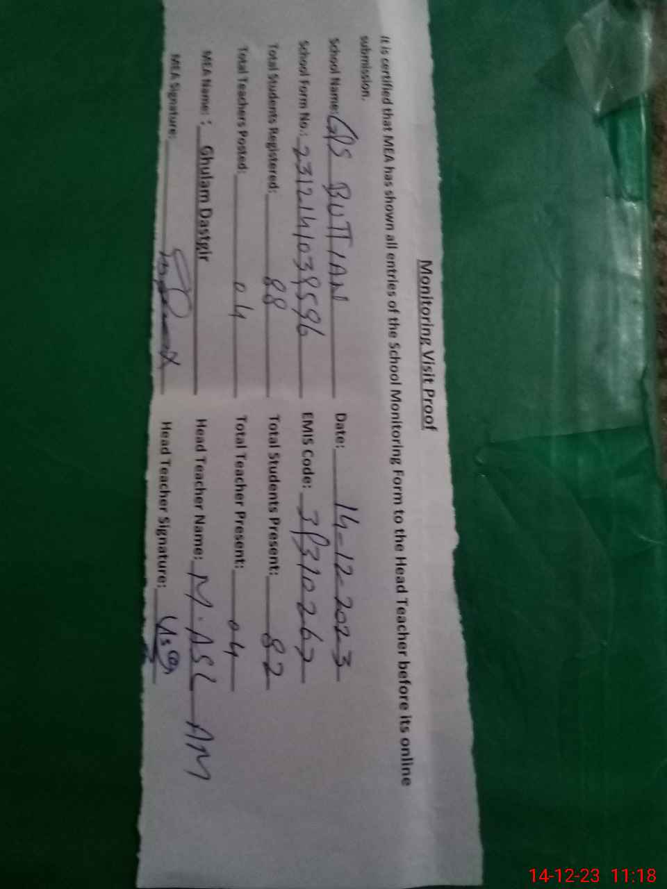 | Attendance Register | Head Teacher | MEA with School | Visit Proof |