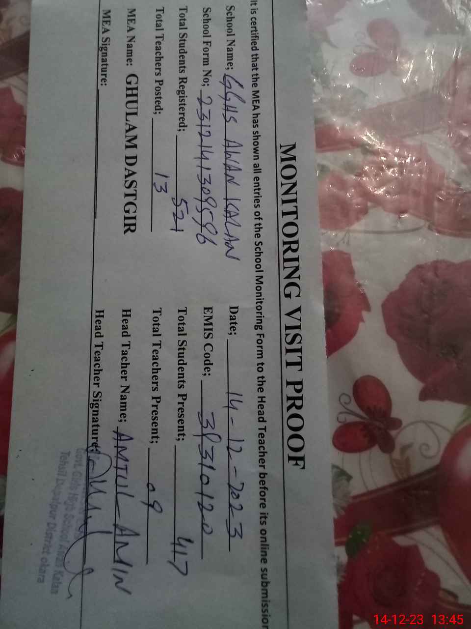 | Attendance Register | Head Teacher | MEA with School | Visit Proof |