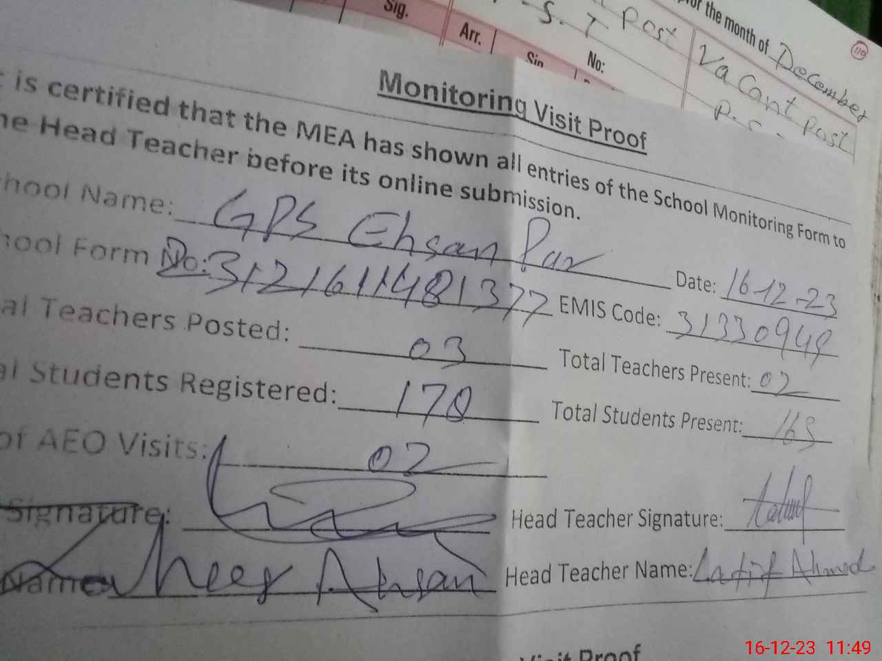 | Monitoring Date: 16-12-2023 | Start Time: 16-12-2023 11:20 AM | End Time: 16-12-2023 11:51 AM | Name of MEA: Za**** Ah**** | |