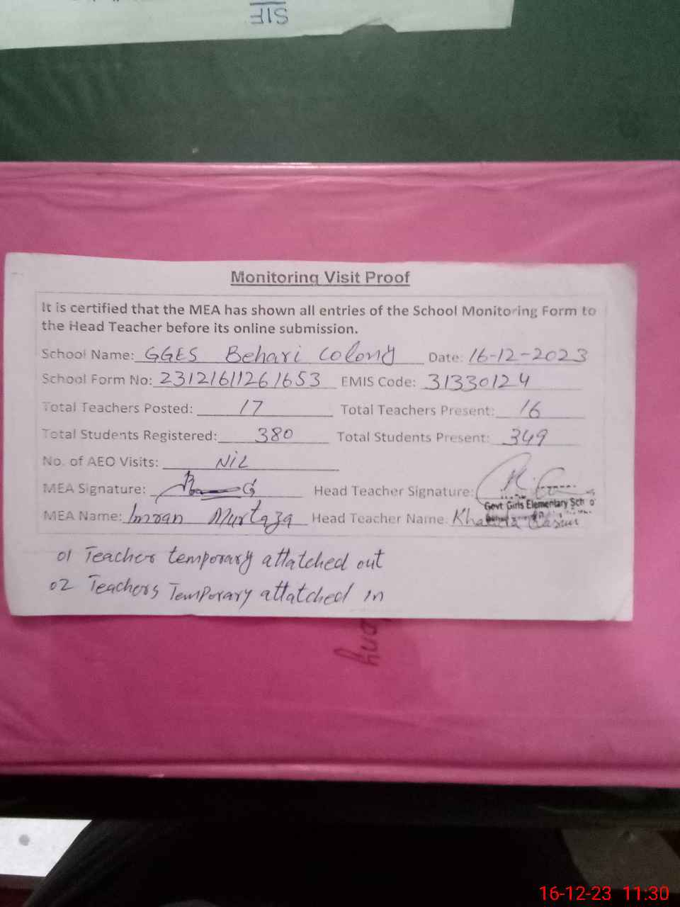 | EMIS Code: 31330124 | Name of School: GGES BEHARI COLONY | |||