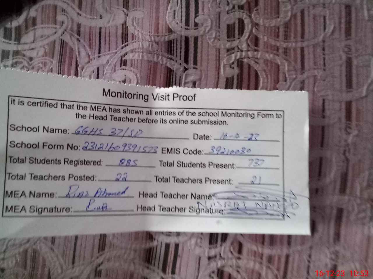 | Attendance Register | Head Teacher | MEA with School | Visit Proof |