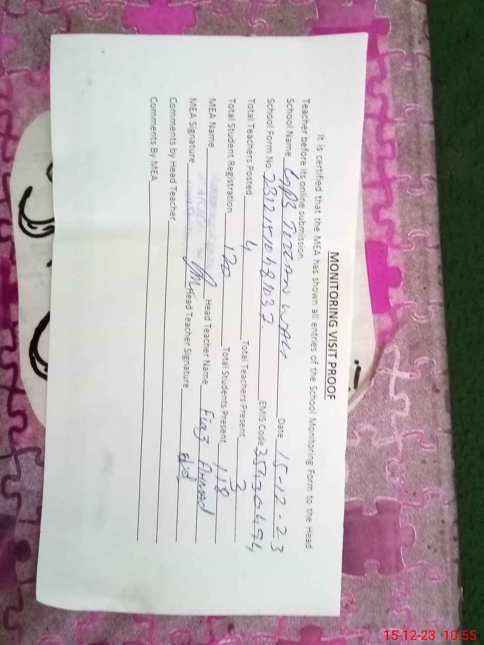 | Attendance Register | Head Teacher | MEA with School | Visit Proof |