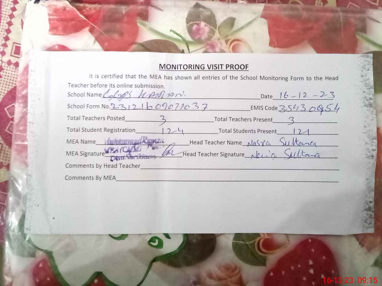 | Attendance Register | Head Teacher | MEA with School | Visit Proof |