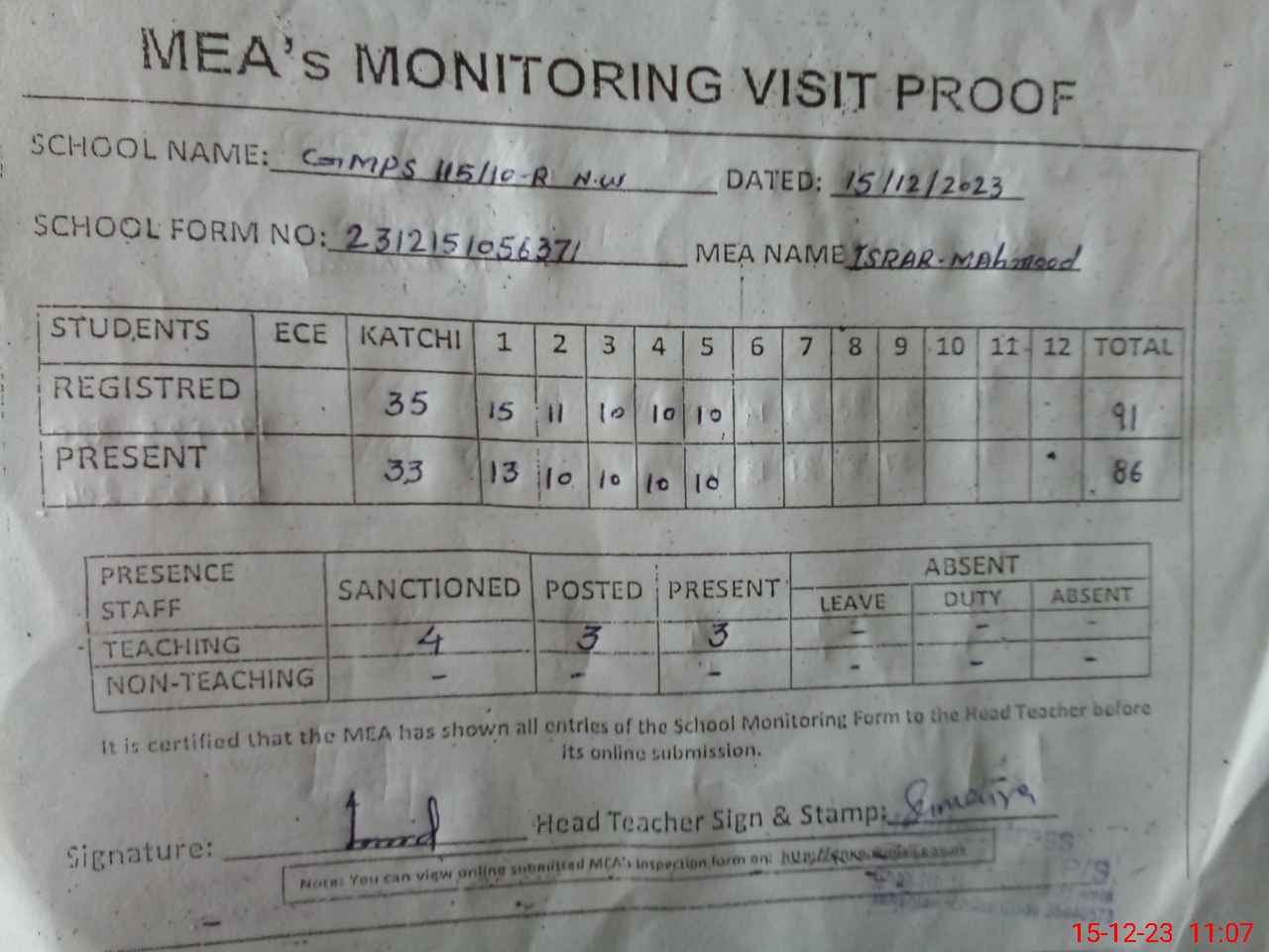| Attendance Register | Head Teacher | MEA with School | Visit Proof |