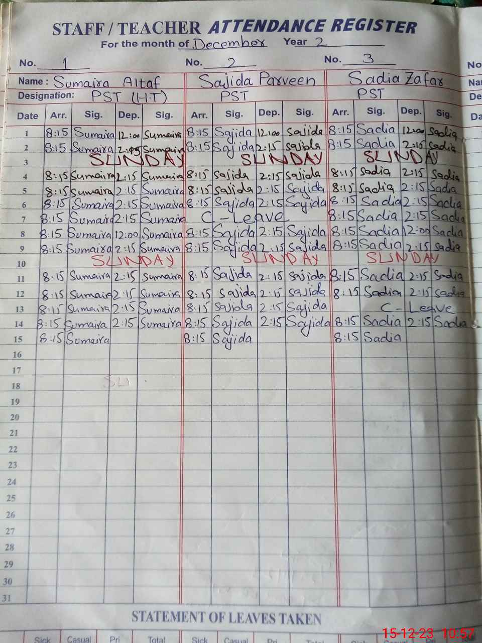 | CNIC | Full Name | Designation | R/C | Absence During Last Calender Month |
