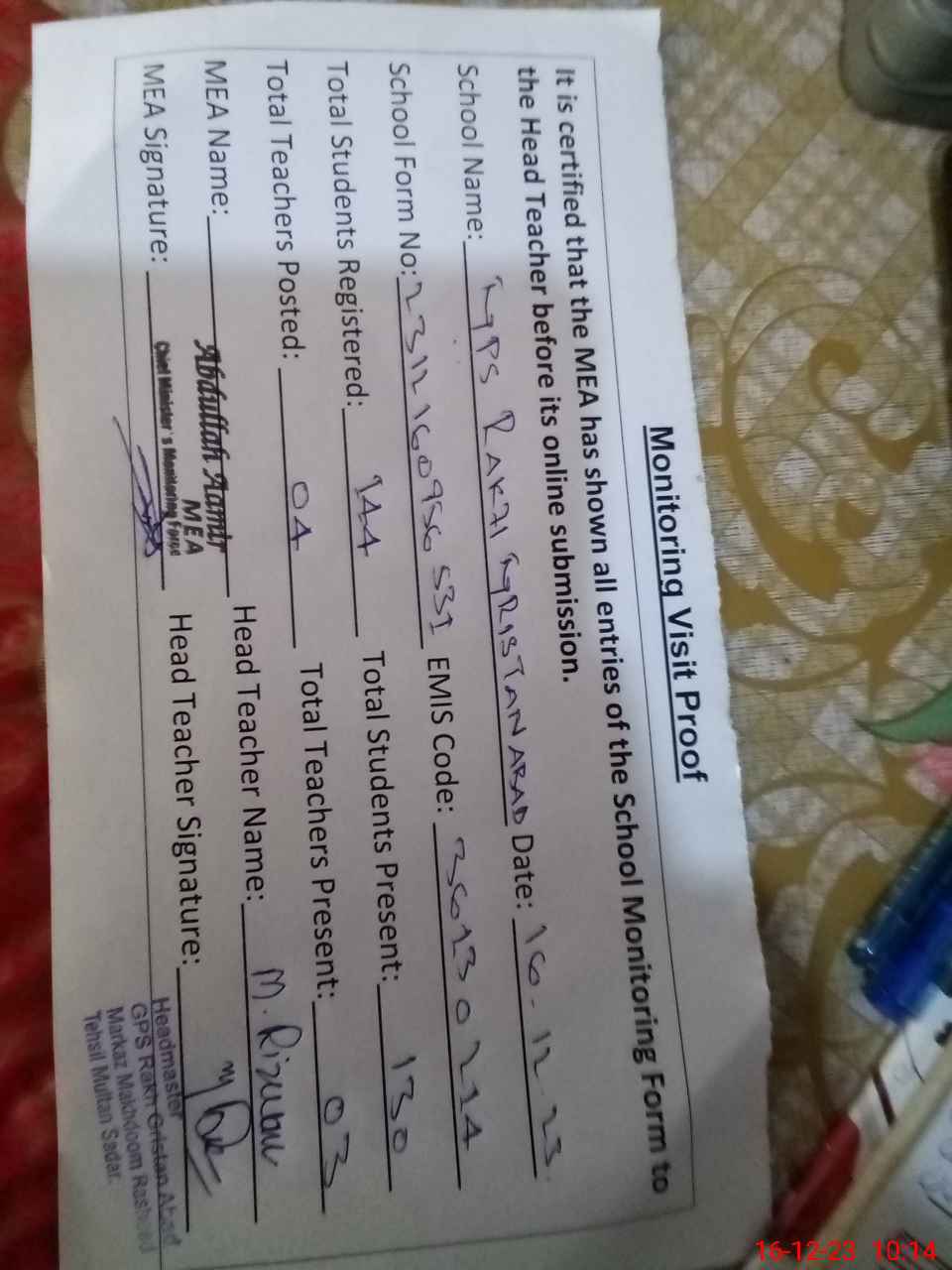 | Attendance Register | Head Teacher | MEA with School | Visit Proof |