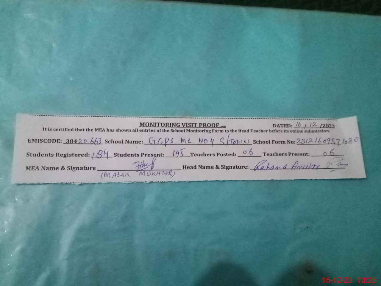 | Attendance Register | Head Teacher | MEA with School | Visit Proof |