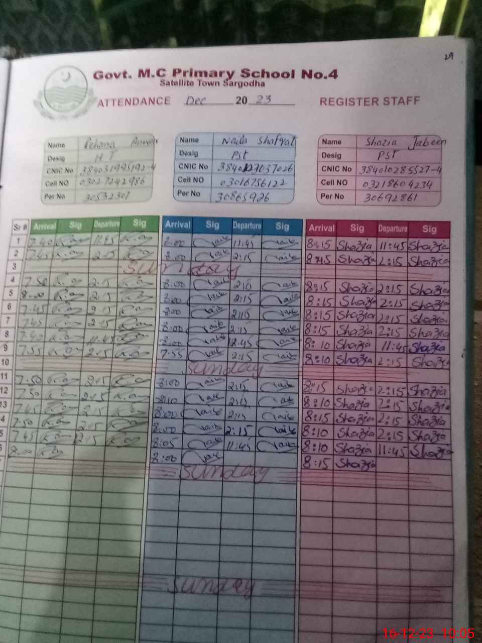 | CNIC | Full Name | Designation | R/C | Absence During Last Calender Month |