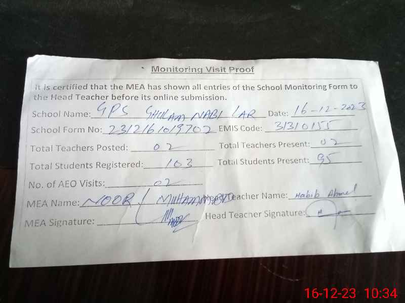 | EMIS Code: 31310155 | Name of School: GPS GHULAM NABI LAR | |||