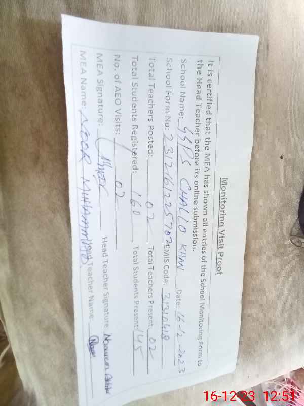 | EMIS Code: 31310418 | Name of School: GGPS CHALLU KHAN | |||