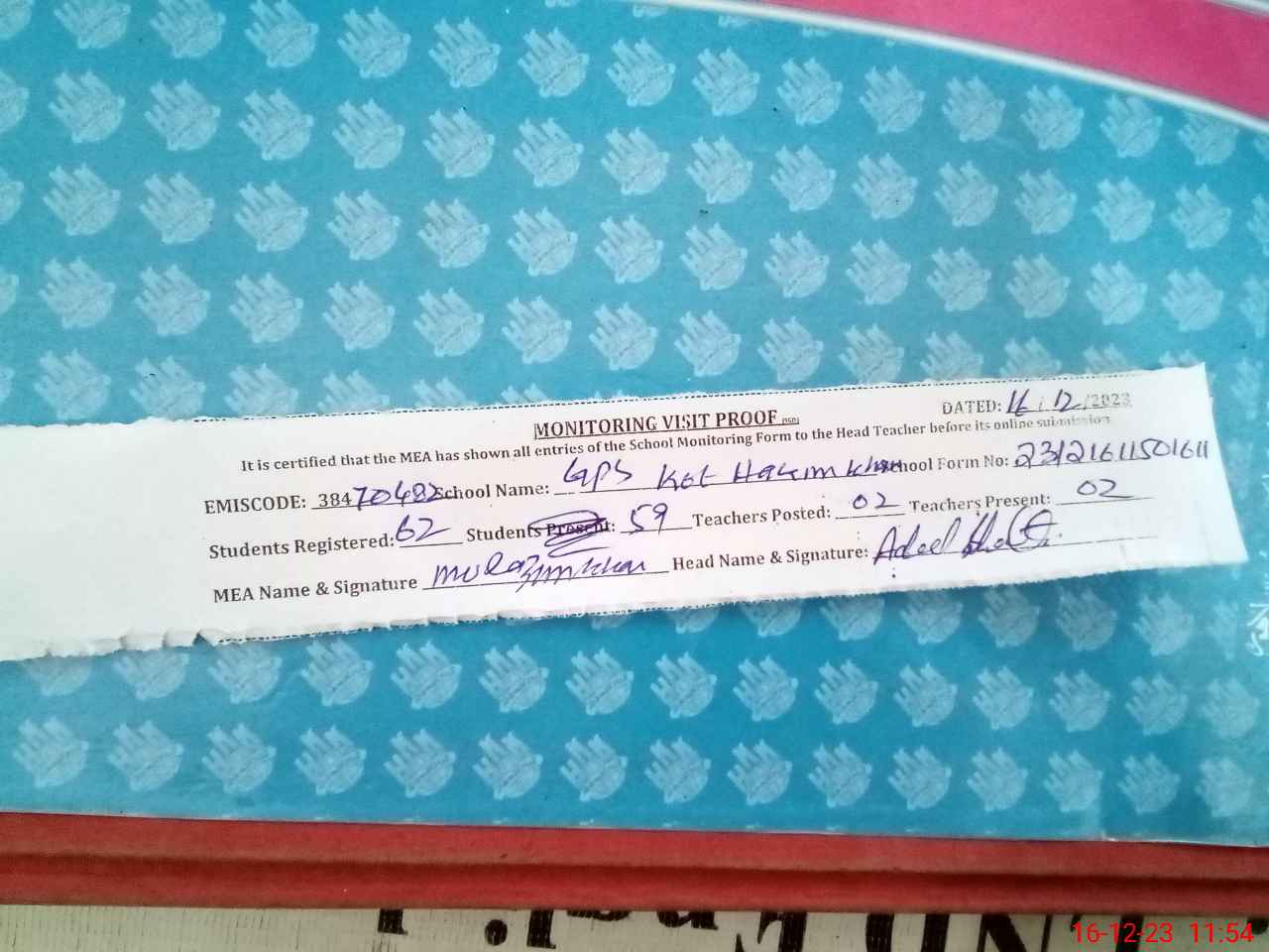 | Attendance Register | Head Teacher | MEA with School | Visit Proof |