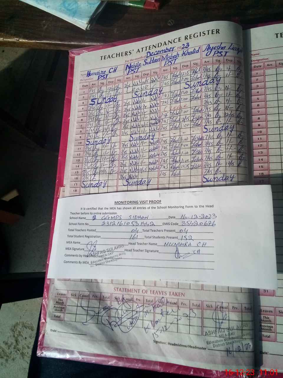 | Attendance Register | Head Teacher | MEA with School | Visit Proof |