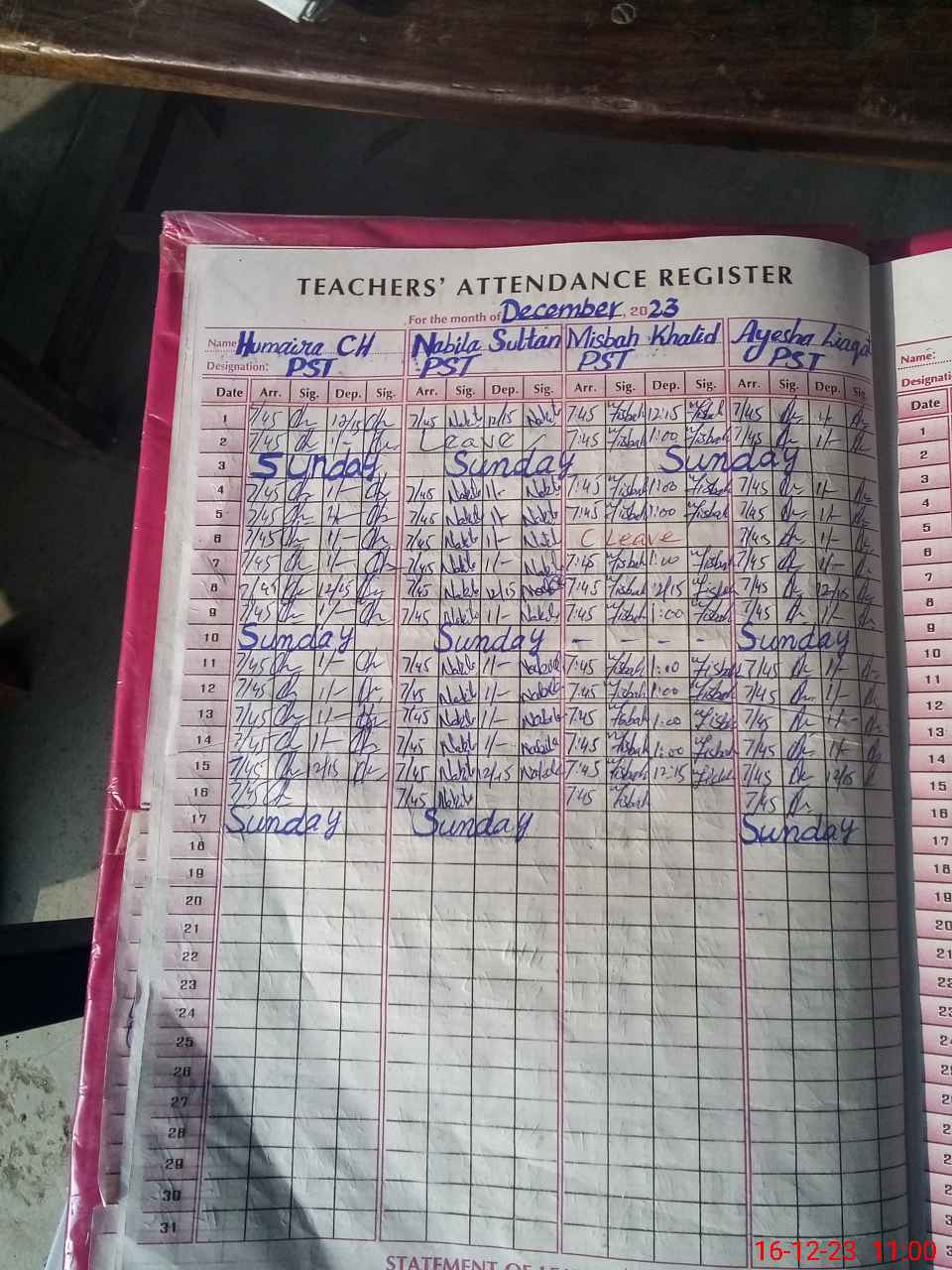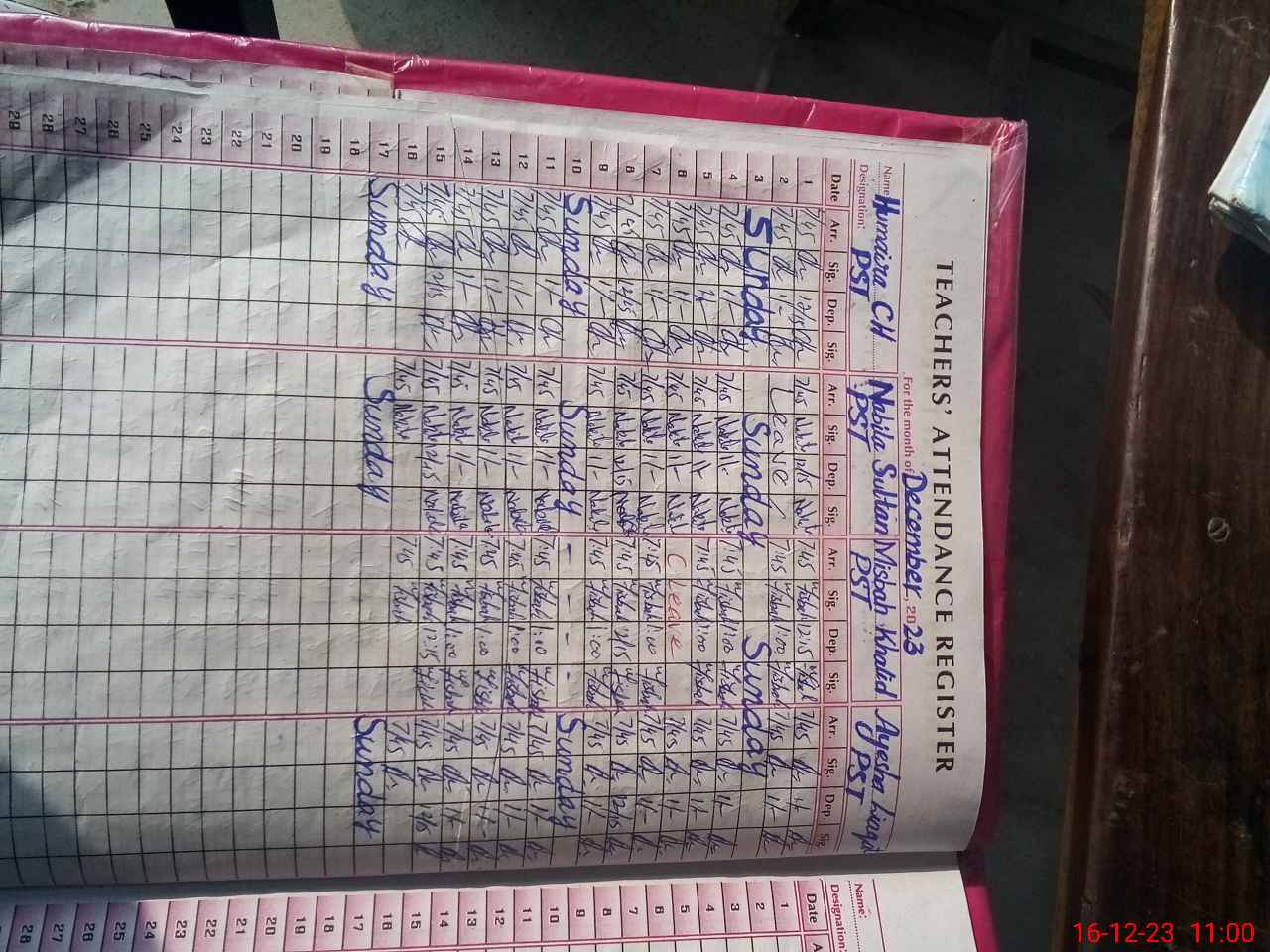| CNIC | Full Name | Designation | R/C | Absence During Last Calender Month |