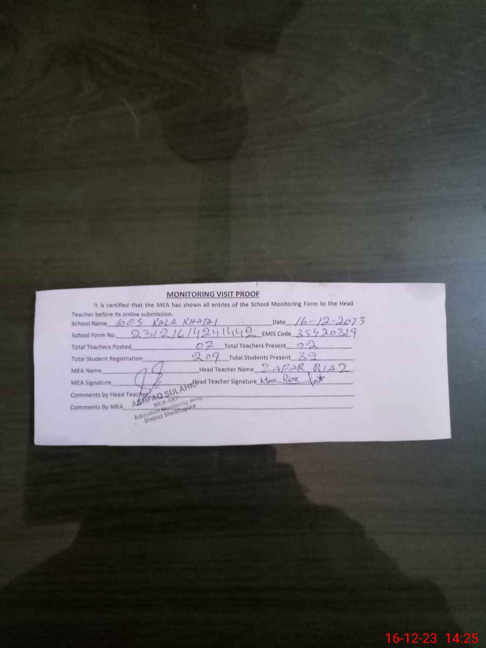 | Certified that this School was Inspected by the Undersigned MEA/DMO Today and the Information Stated Above is as Per Record. | |||||