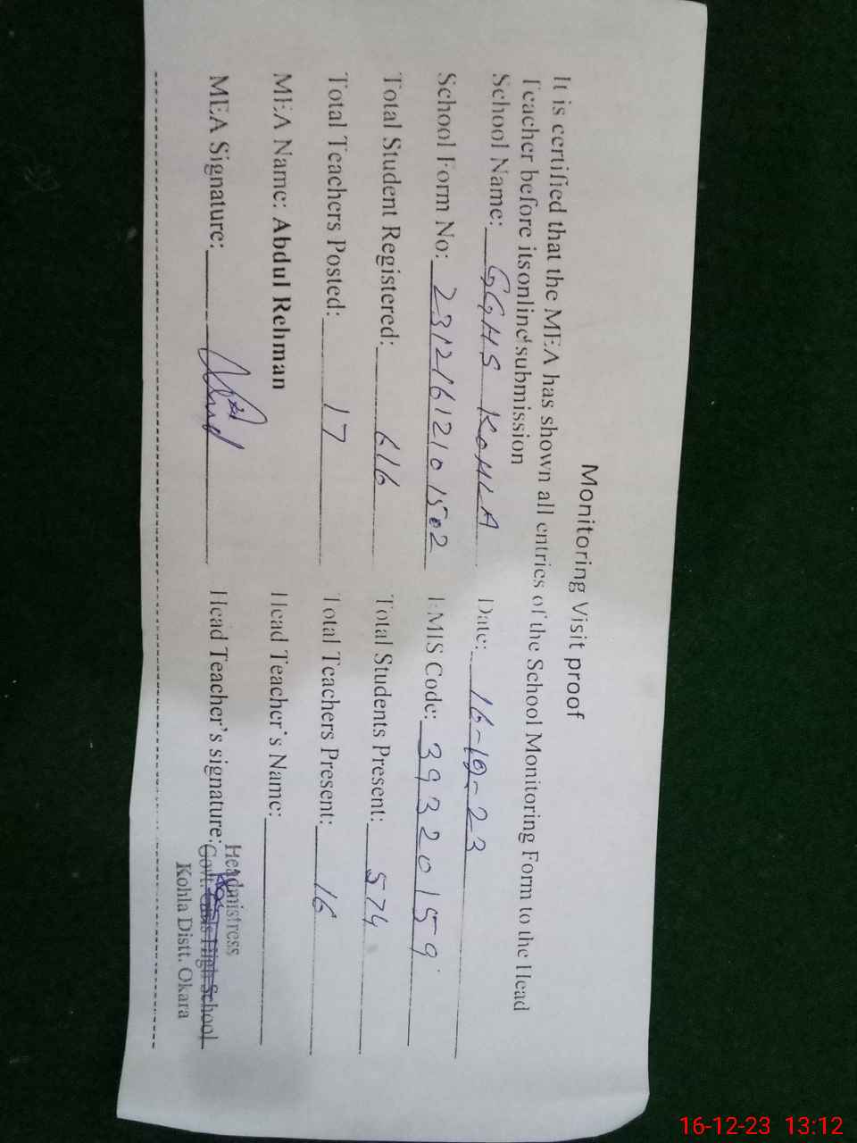 | Name: KI**** NA**** Designation: (School Headmaster's/Headmistress's) S.S.T.(Science) Phone/Cell Number: 03**** |