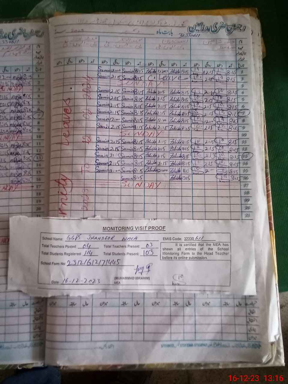 | Attendance Register | Head Teacher | MEA with School | Visit Proof |