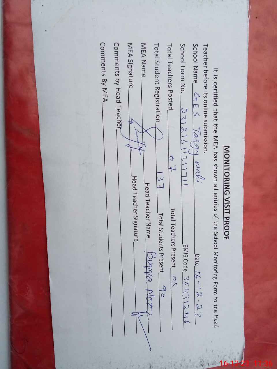 | Attendance Register | Head Teacher | MEA with School | Visit Proof |