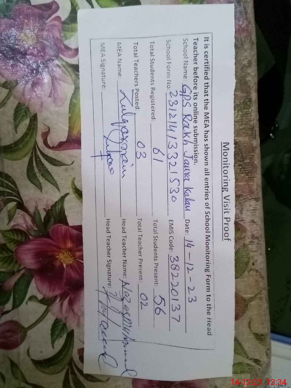 | Attendance Register | Head Teacher | MEA with School | Visit Proof |