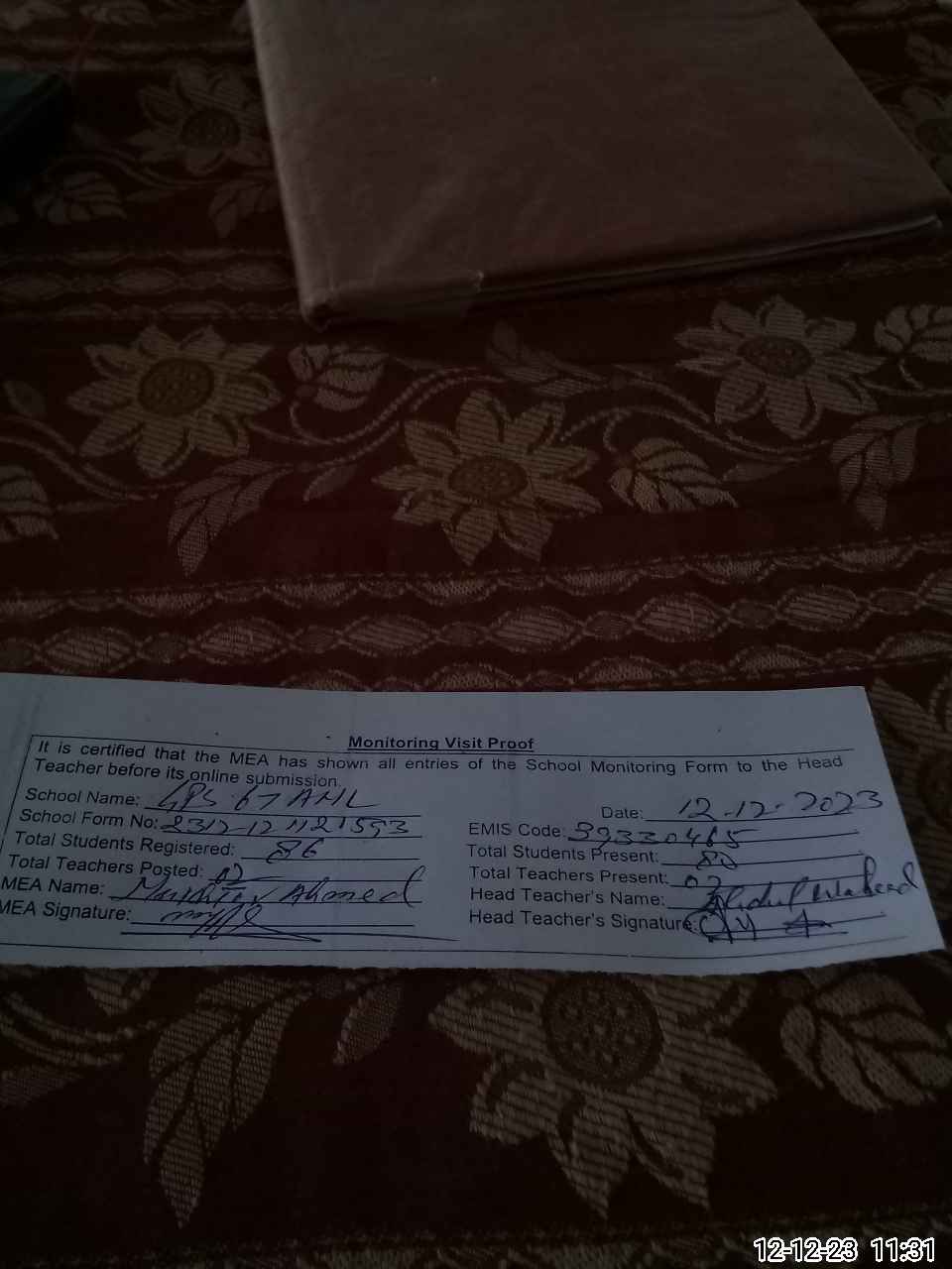 | Attendance Register | Head Teacher | MEA with School | Visit Proof |