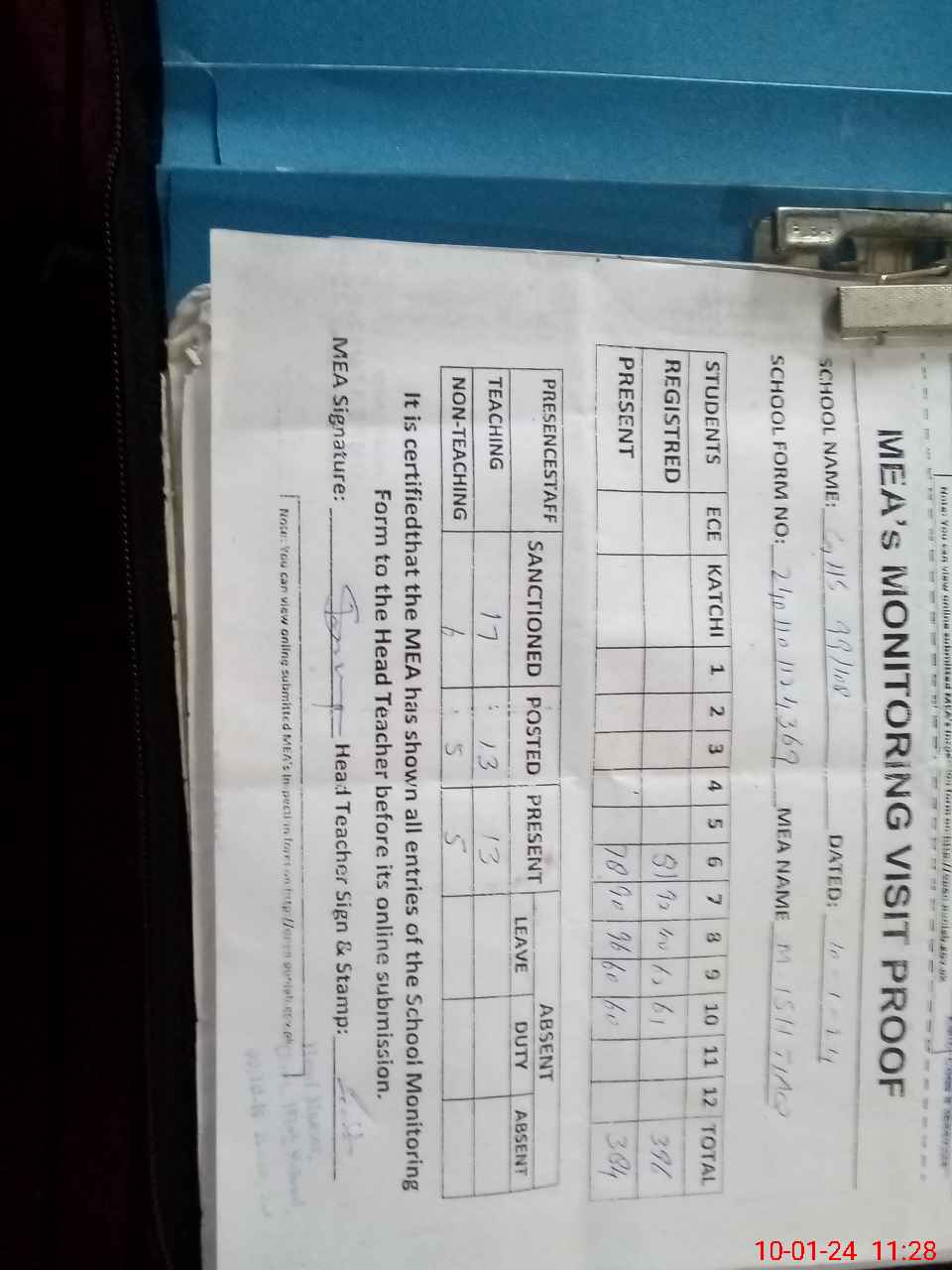 | Attendance Register | Head Teacher | MEA with School | Visit Proof |