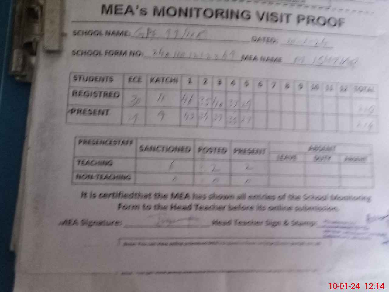 | Attendance Register | Head Teacher | MEA with School | Visit Proof |