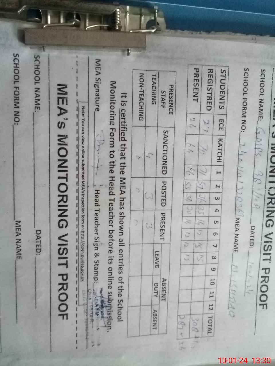 | Attendance Register | Head Teacher | MEA with School | Visit Proof |