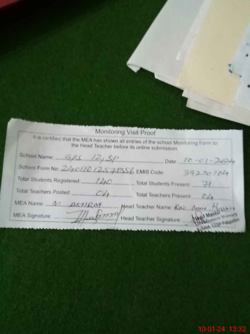 | Attendance Register | Head Teacher | MEA with School | Visit Proof |