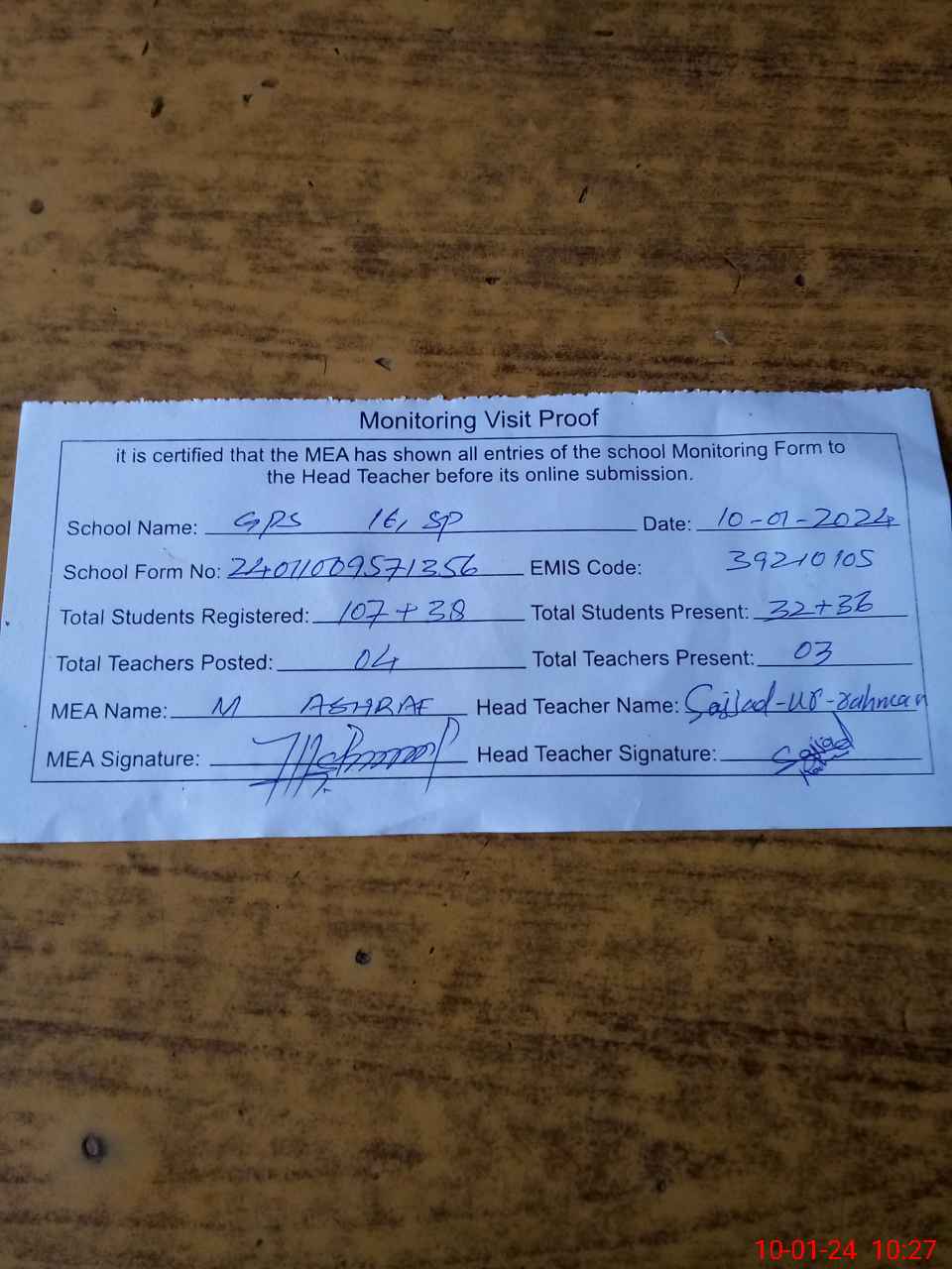 | Attendance Register | Head Teacher | MEA with School | Visit Proof |