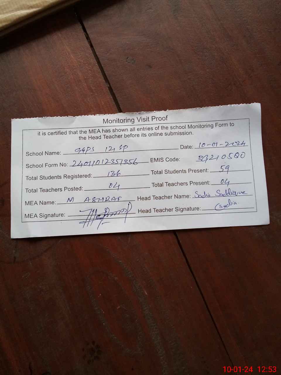 | Attendance Register | Head Teacher | MEA with School | Visit Proof |