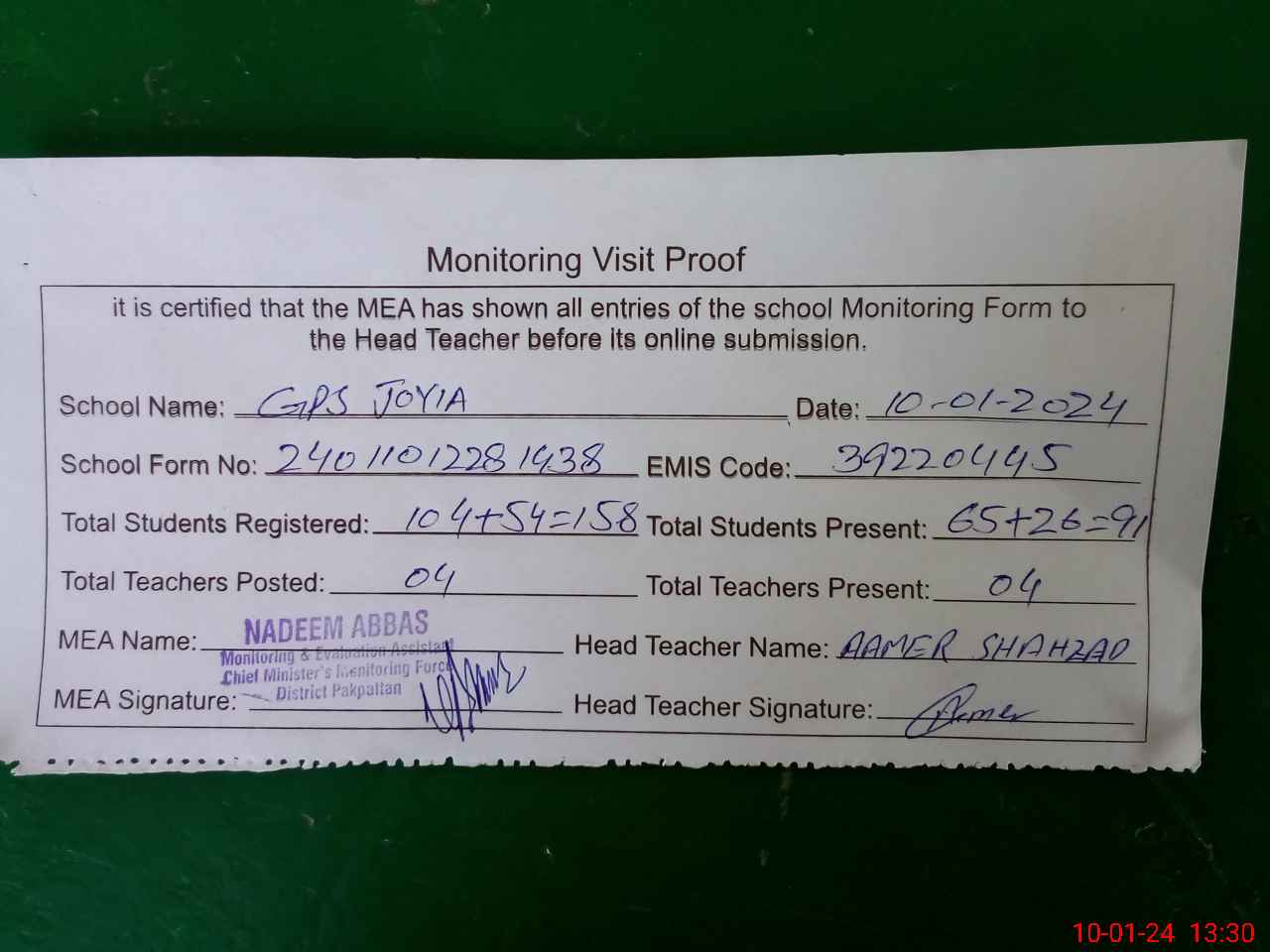| EMIS Code: 39220445 | Name of School: GPS JOYIA P.O NOORA PATH ARIF WALA | |||