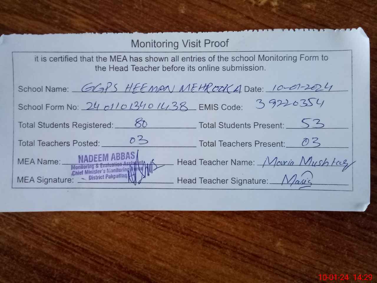 | EMIS Code: 39220354 | Name of School: GGPS HEEMAN MEHROOKA | |||