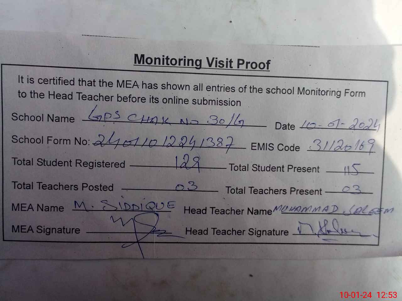 | Attendance Register | Head Teacher | MEA with School | Visit Proof |