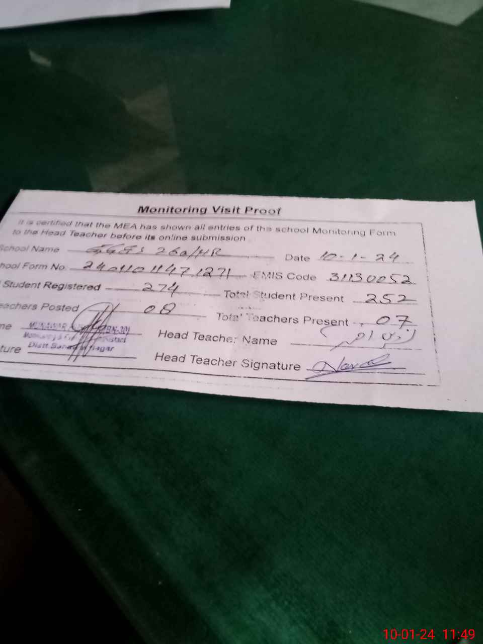 | Attendance Register | Head Teacher | MEA with School | Visit Proof |