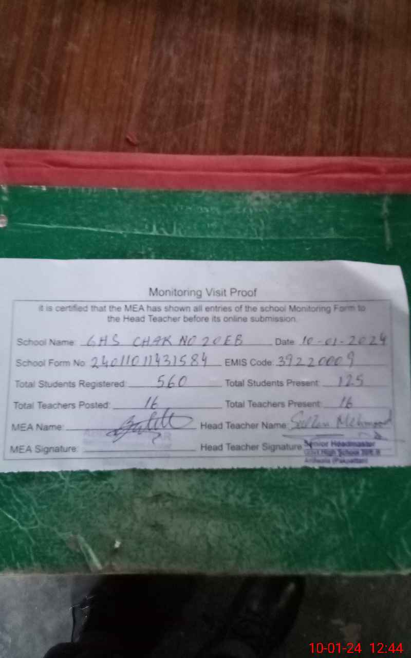 | EMIS Code: 39220009 | Name of School: GHS CHAK NO. 20/EB ARIFWALA | |||