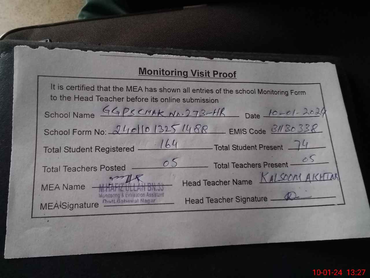 | EMIS Code: 31130338 | Name of School: GGPS CHAK NO 273 HR | |||