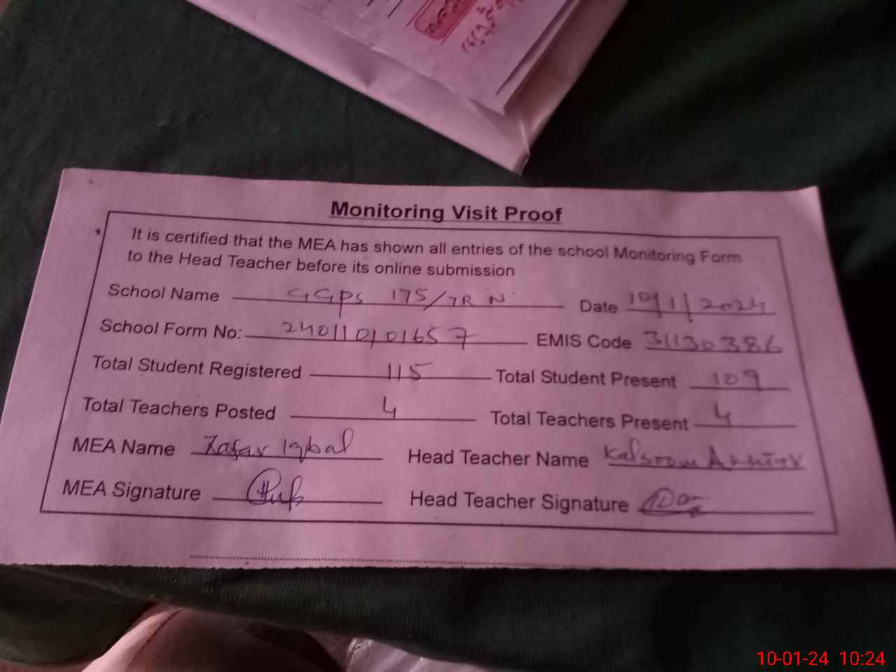 | Monitoring Date: 10-01-2024 | Start Time: 10-01-2024 10:10 AM | End Time: 10-01-2024 10:26 AM | Name of MEA: Za**** Iq**** BN**** | |