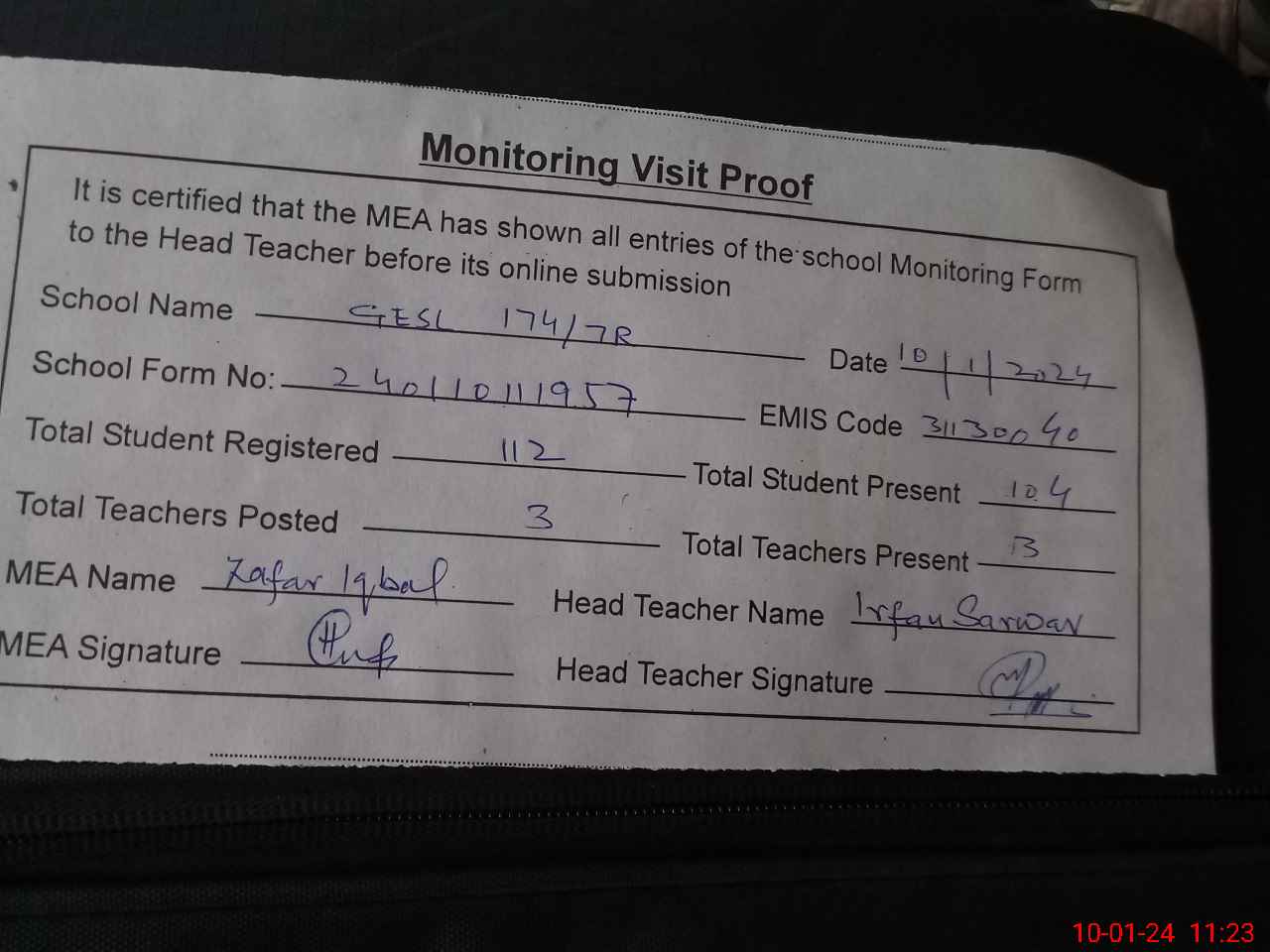 | Monitoring Date: 10-01-2024 | Start Time: 10-01-2024 11:04 AM | End Time: 10-01-2024 11:23 AM | Name of MEA: Za**** Iq**** BN**** | |
